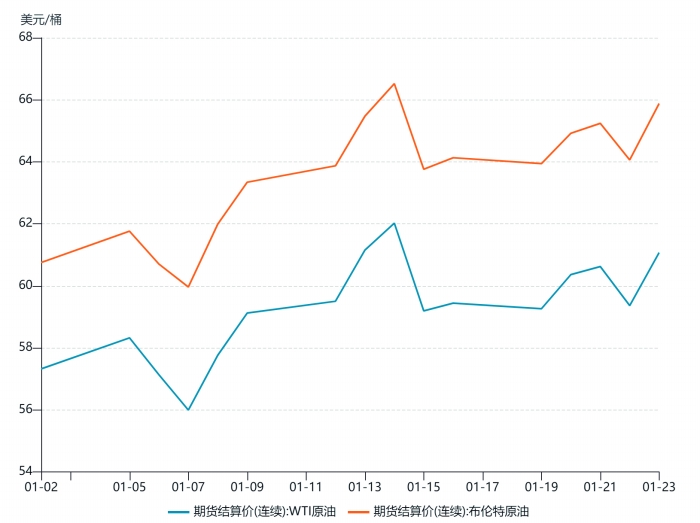 从价格角度来看,油价短期小幅走高。1月23日,纽约商品交易所3月交货的轻质原油期货价格收于每桶61.07美元;3月交货的伦敦布伦特原油期货价格收于每桶65.88美元。